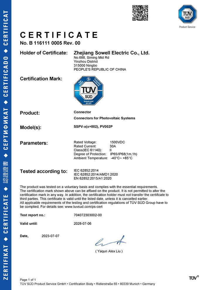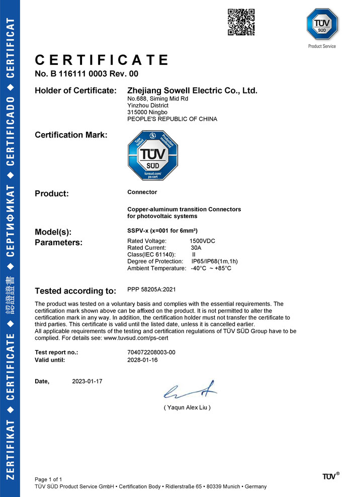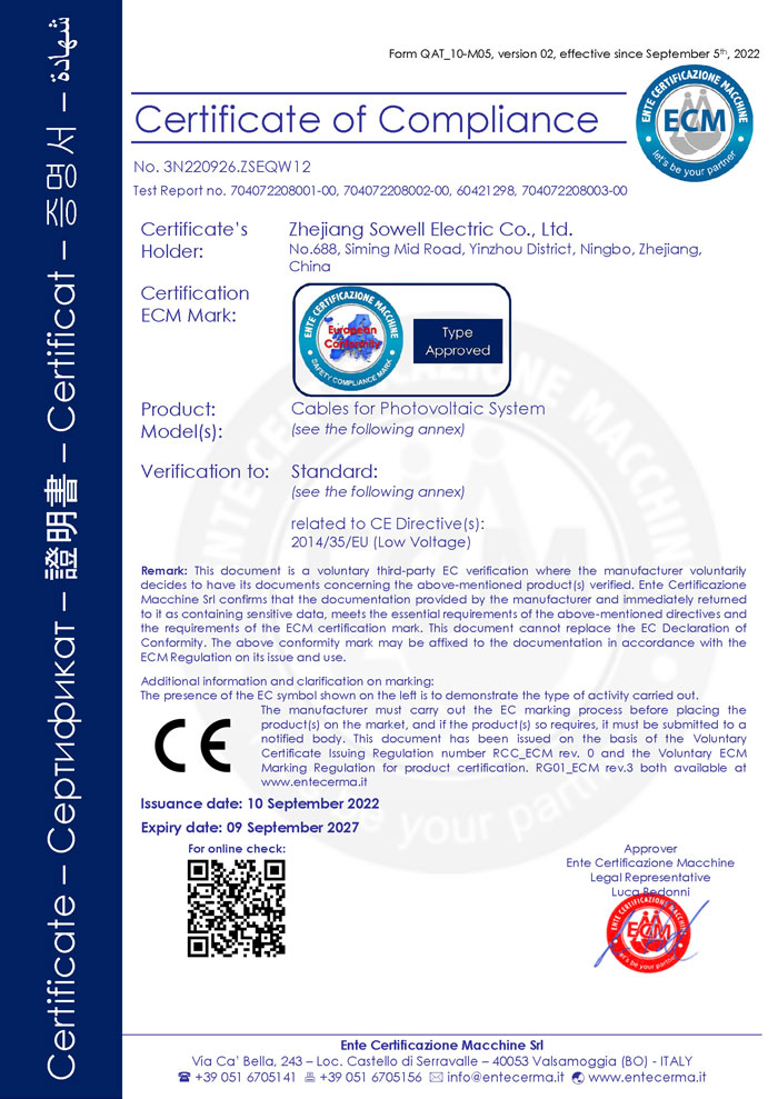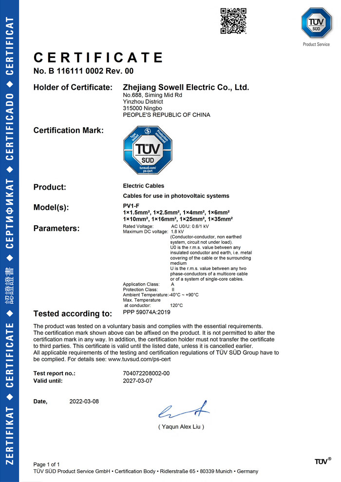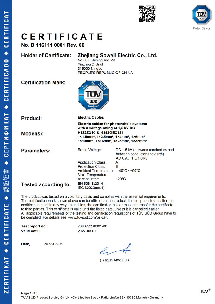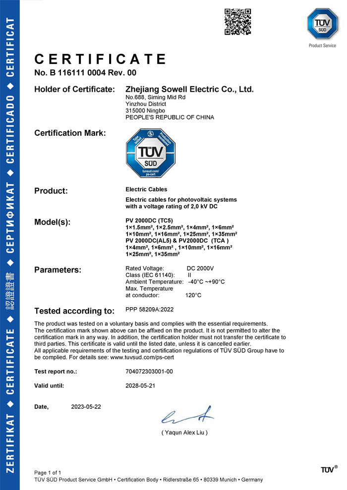 Zhejiang Sowell Electric Co., Ltd.は2006年に太陽光発電産業の事業を開始しました。初期段階では、2 PFG 1161、DIN V VDE V 0126-3、EN50521、2 PFG 1169などの一連の規格に基づく製品認証に参加しました。2019年には、当社の主力製品で輸出市場を拡大しています。ソーラーケーブルそしてPVコネクタ(H1Z2Z2-K、PV1-F、PV2000DC、TCA、SSPV-00Xシリーズ)。責任あるブランドとして、SOWELLSOLAR は電流耐性、照射、架橋が認定されることを厳粛に約束します。各バッチに不足はありません。当社は製品開発・生産サービス体制を整え、世界中の顧客に優れた製品とサービスを提供するよう努めています。おすすめ商品
