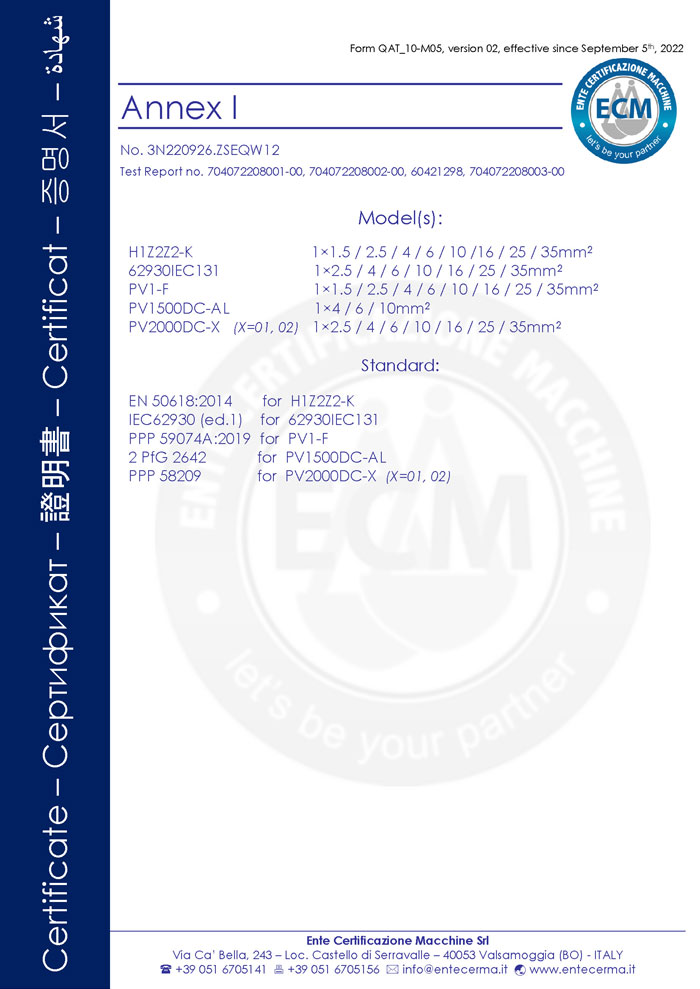 IEC 62930、EN 50618、TÜV 2 PFG、UL 4703に完全準拠